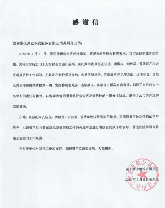 近日,優(yōu)派克集團(tuán)安保公司蘇州分公司,收到客戶單位的表?yè)P(yáng)信,信中對(duì)駐點(diǎn)安保日常工作,特別是疫情期間的辛勞付出給予了極大的肯定和褒獎(jiǎng)。合肥保安服務(wù)優(yōu)派克竭力為您服務(wù)!