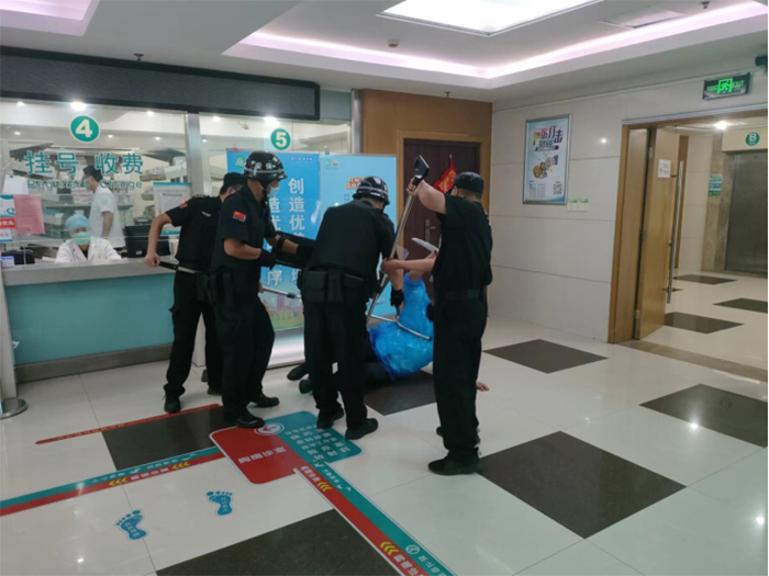 演練現(xiàn)場模擬一暴恐分子持刀強行闖崗,執(zhí)勤保安迅速報保衛(wèi)科及分管領(lǐng)導(dǎo),并撥打110報警電話,同時疏散就醫(yī)群眾和工作人員。